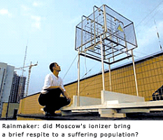 They devised a cunning plan. The emergency situations ministry set up an ionizer on the roof of its building in western Moscow to create artificial rainclouds over the city. The apparatus was supposed to emit oxygen ions to raise humidity.