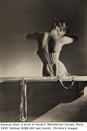 Bidding on "Mainbocher Corset, Paris, 1939", the lot with the highest estimate of $100,000 to $150,000, one of a series of five prints and the last photograph Horst took before leaving Paris before the second world war, did not disappoint. Eventually a telephone buyer won out.